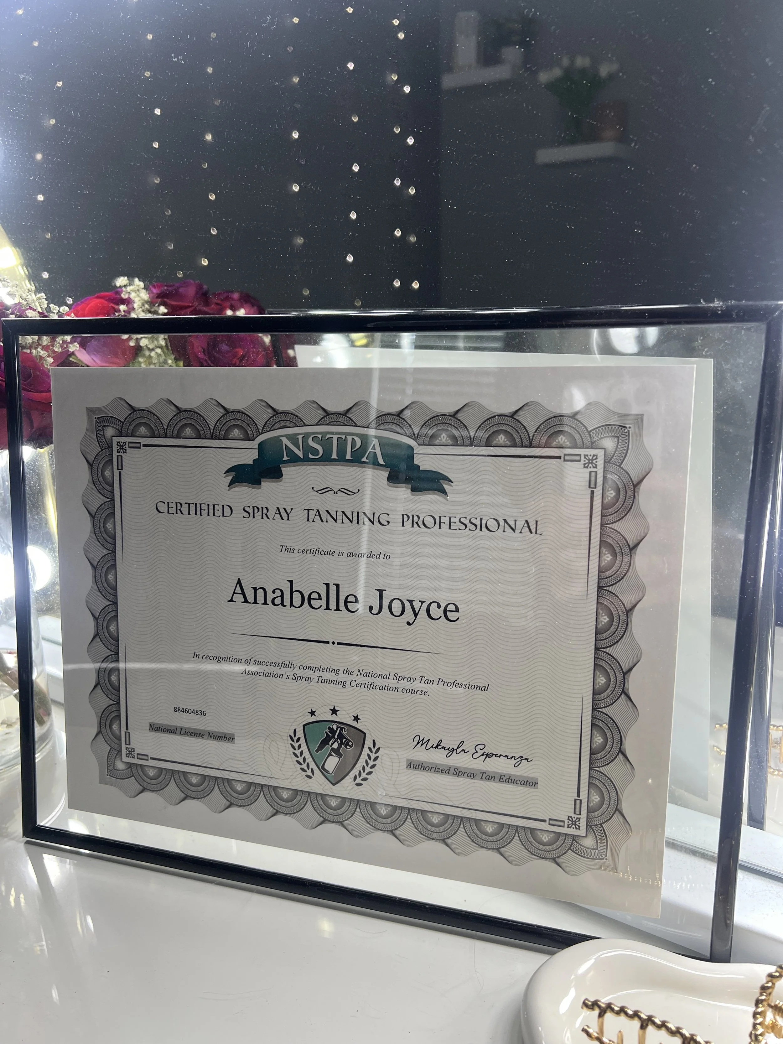 My name is Anabelle, I LOVE having the best-bronzed tan. A perfect-looking tan is something I am very passionate about. I decided, what better way than to make you guys feel beautiful with the perfect bronzed tan? I decided to educate myself and get certified to be a spray tan artist. I need to be very knowledgeable and confident in what I do. I wanted to stick out from your average spray tan, I am not charging any additional fees for add-ons, including added scents and glow shimmer drops! As well as creating a custom tan fit just for you and your wants.